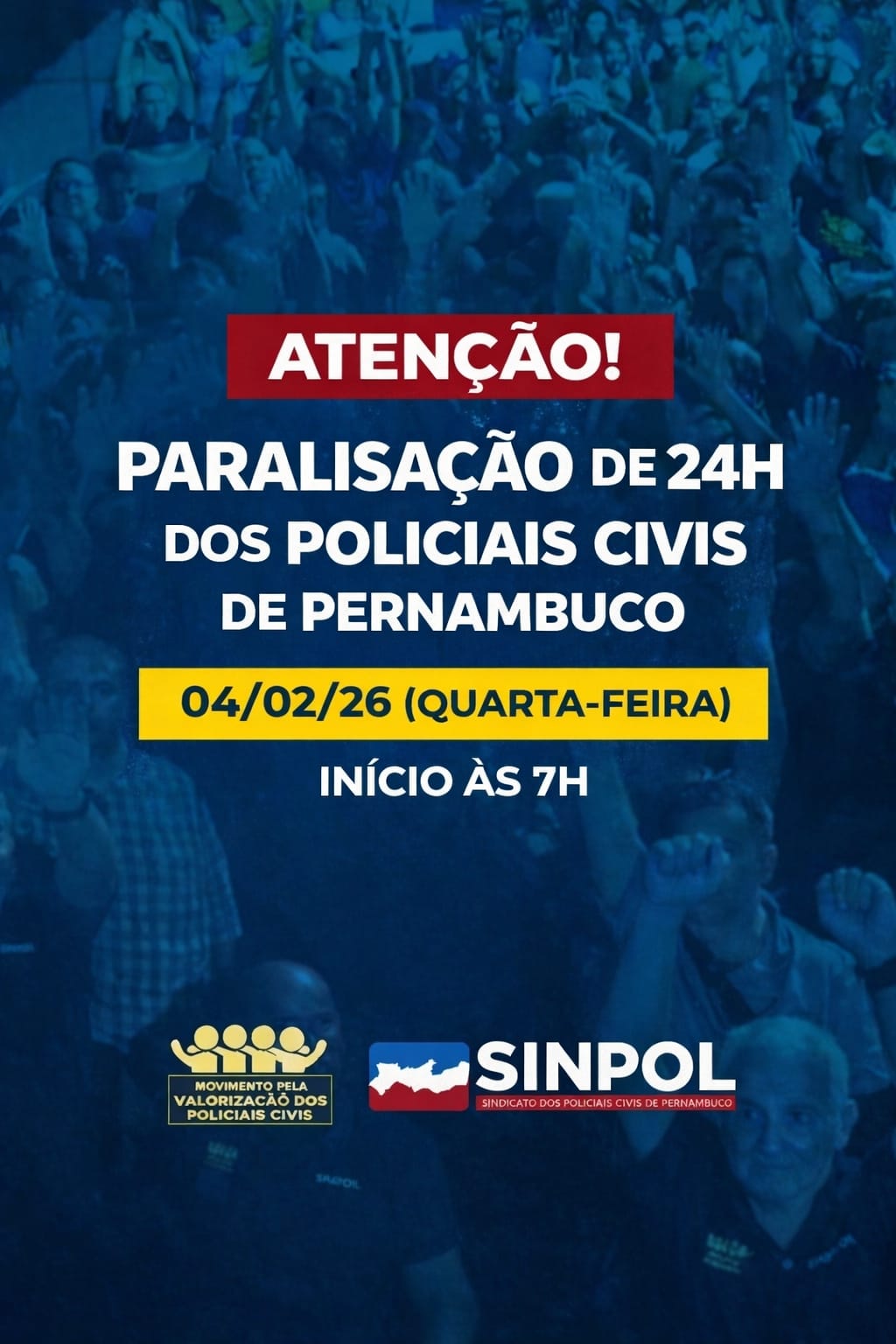 Os policiais civis de Pernambuco anunciaram uma paralisação de 24 horas a partir das 7h desta quarta-feira (4), após, segundo as entidades representativas, não haver avanços em tentativas de diálogo com o Governo do Estado. O movimento, convocado pelo Sindicato dos Policiais Civis de Pernambuco (Sinpol) e pelo Movimento pela Valorização dos Policiais Civis, aponta que as reivindicações estão relacionadas à valorização profissional, às condições de trabalho e à política salarial, e têm como objetivo chamar a atenção da sociedade e do poder público para as demandas da categoria.