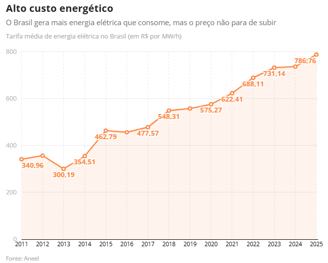 No ano passado, energia elétrica residencial subiu 12,31%, segundo o IBGE. Foi o subitem de maior impacto individual no IPCA, que fechou 2025 em 4,26%. O aumento só não foi maior porque o governo aplicou R$ 2,2 bilhões em descontos na tarifa a partir de um bônus da Usina Hidrelétrica de Itaipu. Considerando apenas o megawatt-hora, o custo de energia atingiu R$ 786,76, o maior desde 2011, segundo dados da Agência Nacional de Energia Elétrica.