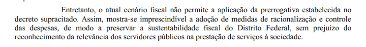 No documento, a pasta afirma que não há “disponibilidade orçamentária” para o pagamento do benefício e orienta que os pedidos não sejam deferidos neste ano eleitoral. A decisão, que diz se basear em critérios de “equilíbrio fiscal e contenção de despesas”, ocorre em meio ao escândalo BRB/Master, que poderá consumir recursos do governo regional.