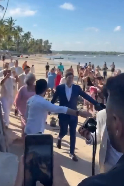 Acompanhado da mãe, Renata Campos, o prefeito João Campos (PSB) chega pela areia da praia à capela em que será celebrado o seu casamento com Tabata Amaral (PSB-SP), em Carneiros, Litoral Sul.