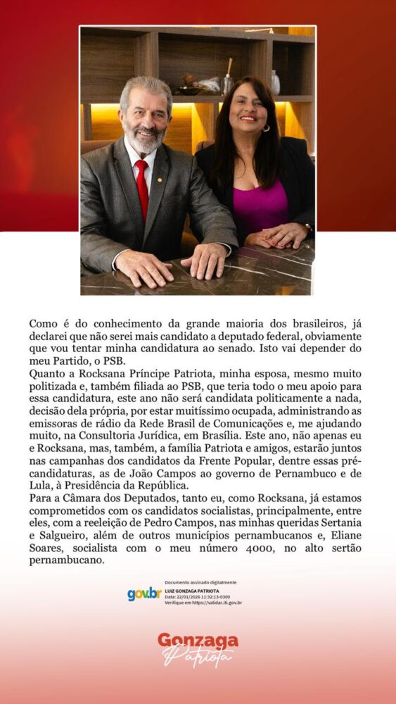 O que disse Gilson– “Troco de partido, mas não de lado. Sigo fiel aos meus ideais e valores. Sempre leal ao presidente Jair Bolsonaro e ao senador Flávio Bolsonaro. Minha relação com o presidente não é de circunstância; foi e é uma parceria construída e baseada na confiança, valores e projetos em comum por um Brasil melhor e mais justo. Continuo sendo o nome defendido pelo presidente Jair Bolsonaro para a disputa ao Senado por Pernambuco. Porém, não sou o nome escolhido pela direção estadual do partido para essa missão. Dessa forma, sigo minha caminhada alinhada aos valores do presidente Bolsonaro”, afirmou Machado.