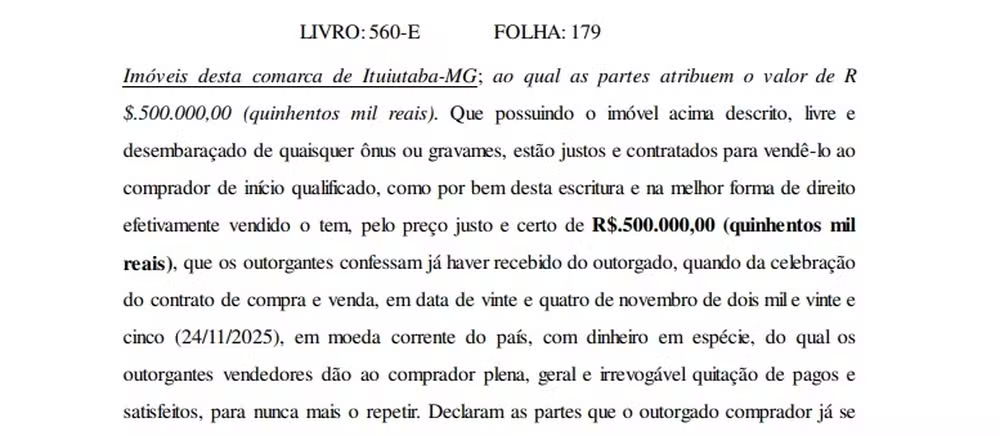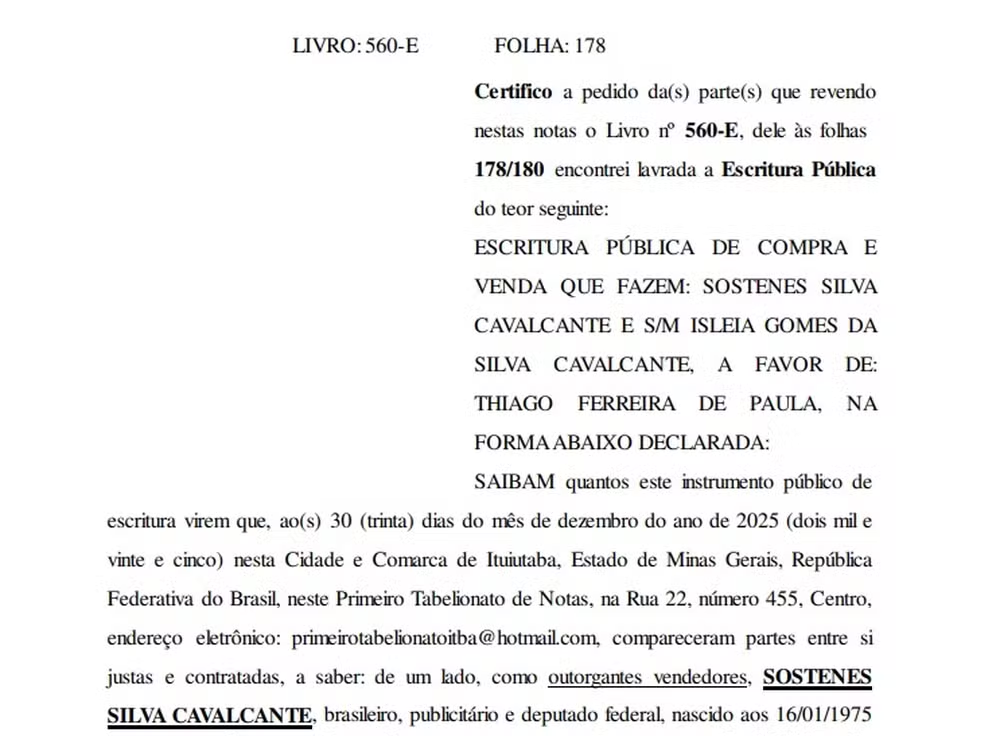 O líder do PL na Câmara, Sóstenes Cavalcante, registrou no dia 30 de dezembro a escritura de venda de um imóvel em Ituiutaba (MG), 11 dias depois de uma operação da Polícia Federal encontrar R$ 430 mil em seu apartamento em Brasília. O deputado argumentou, na ocasião, que o dinheiro em espécie era fruto da venda de uma casa no município do Triângulo Mineiro.