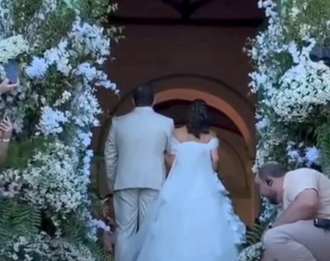 Sob aplausos, a deputada federal Tabata Amaral (PSB-SP) chegou à Capela de São Benedito, na Praia de Carneiros, para o casamento com o prefeito do Recife, João Campos (PSB). A deputada federal usa vestido assinado pela estilista paulistana Julia Pak.